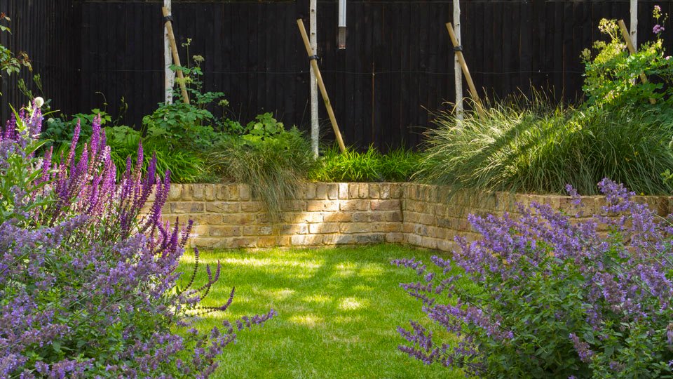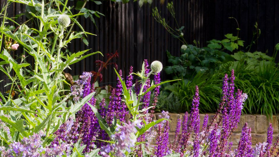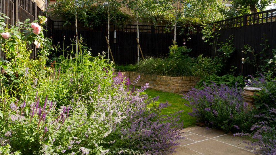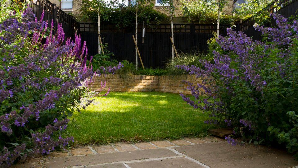 The solution was to work across the space at an angle in order to create planting beds with a depth. This gave us the opportunity to be a little more expansive with the planting. Betula utilis ‘Jacquemontii’ provide screening at the back of the garden and tall fence panels painted black recede into the background offering a sense of space in a small garden and also serving to highlight the planting in front of it. Key plants here are nepeta racemosa ‘Walkers low’, salvia nemorosa ‘caradonna’ and echinops ritro. Actaea racemosa, deschampsia caespitosa ‘goldtau’ and persicaria amplexicaulis ‘rosea’ steal the limelight later in the year.