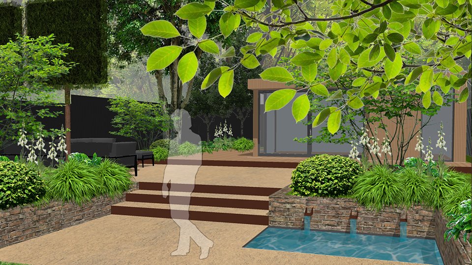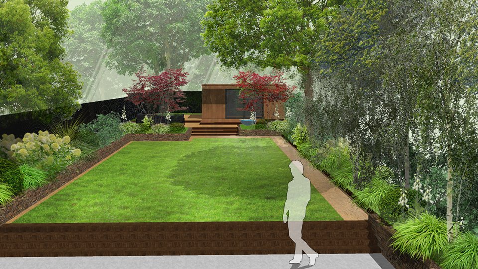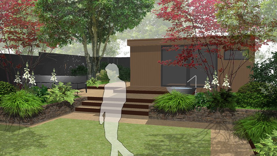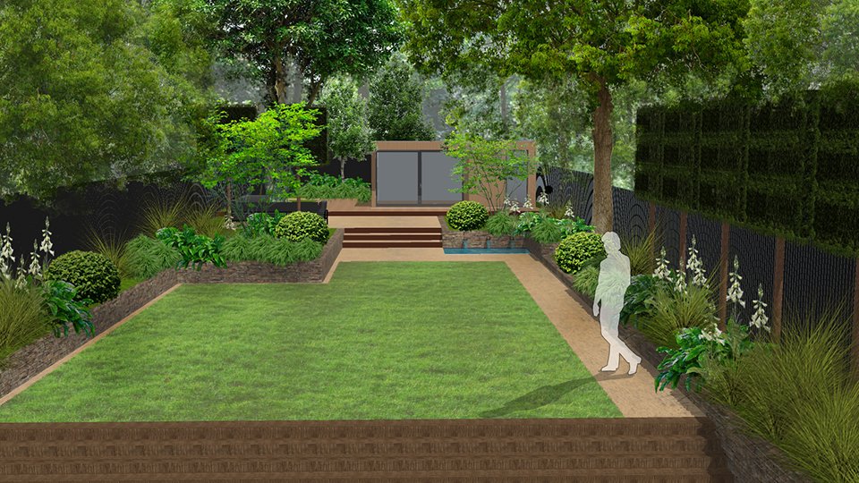 This is a site where the existing context is so beautiful that only the subtlest of interventions would be required. We decided to add clarity and definition to very natural space and designed a central lawn surrounded by lush woodland edge planting. We have created a destination point at the rear, which will consist of an office studio and a soft seating area. Our presentation to the client included two options incorporating a water element in two different perspectives – one with a Japanese contemporary twist and another featuring water wall chutes into a small pool. Planting is soft and dreamy but also strongly textural featuring specimen ornamental trees to support the woodland theme, reminiscent of a  natural Japanese planting scheme.