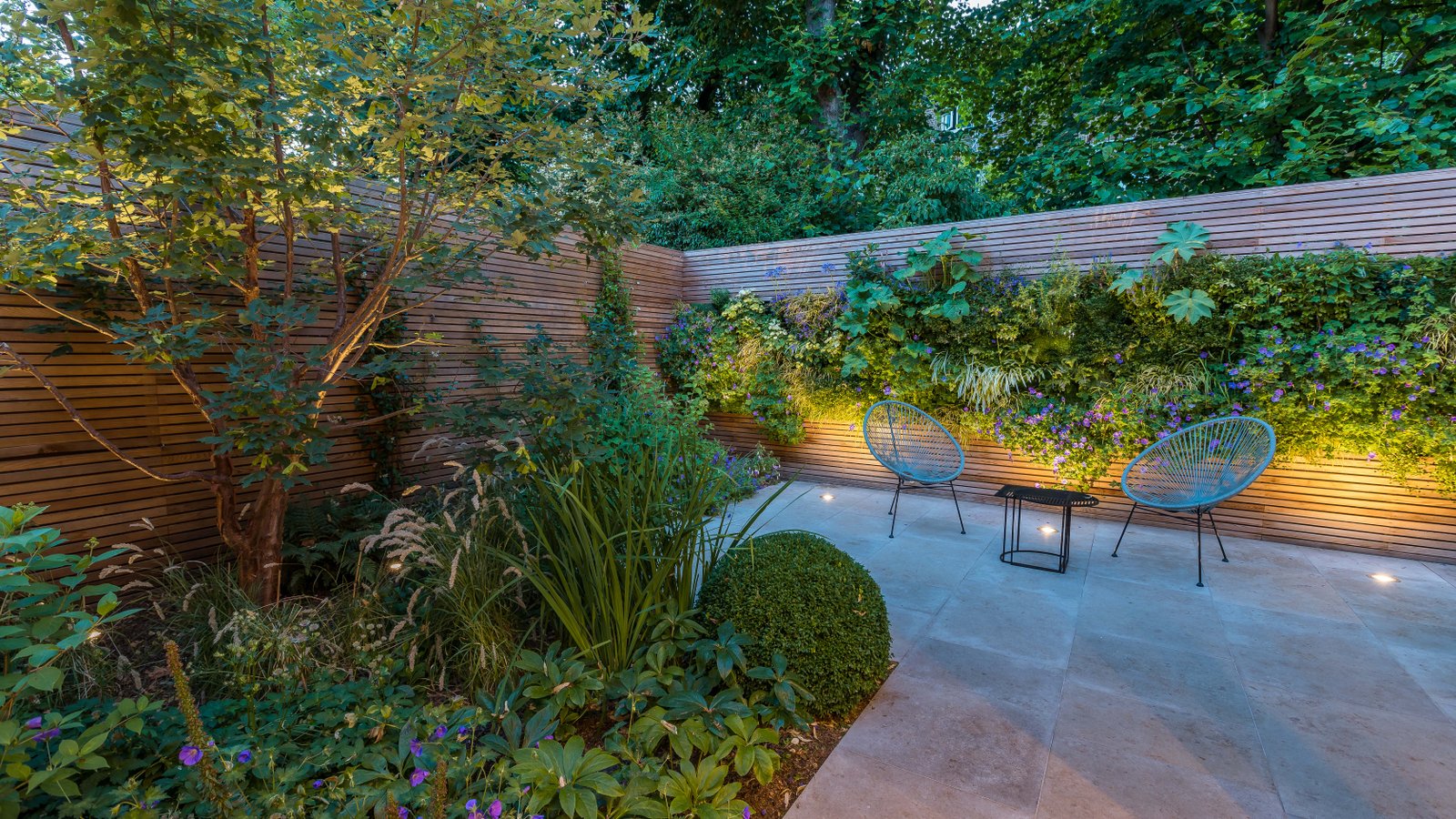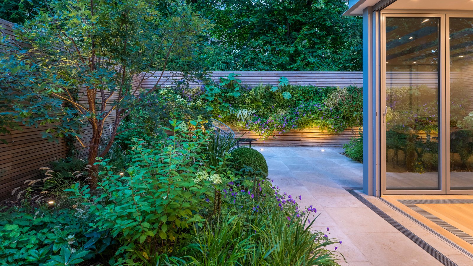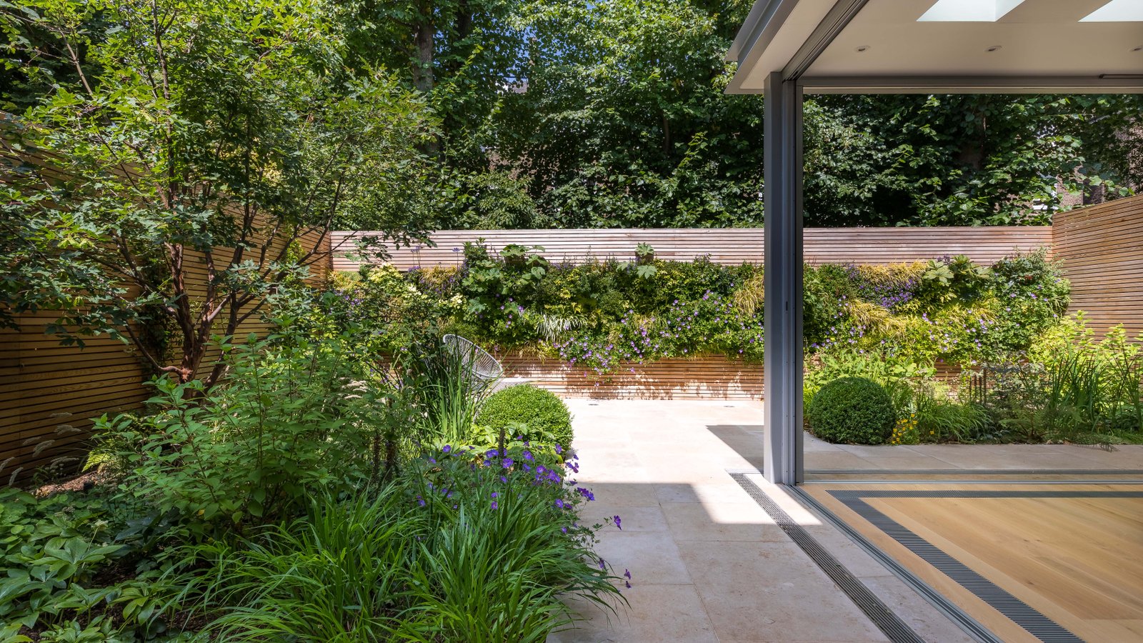 This small urban garden serves as a backdrop to an interior and provides a leafy and dramatic view through the edge-to-edge windows. Exterior gently blends with the interior and provides options for outdoor dining/entertainment all year round due to the carefully selected planting palette. Planting is inspired by the plants that grow naturally within the woodland edge range. Ornamental grasses, soft textures and deep green notes work beautifully together to provide a comfortable, peaceful and lush atmosphere throughout the year. The stunning 10 m long green wall continues the linearity of the design masking the existing rear garden wall. It also makes the space feel wider when viewed from within. Planting from the wall is also referenced at ground level so that the two planes meld together seamlessly to present an over-archingly green outside space.