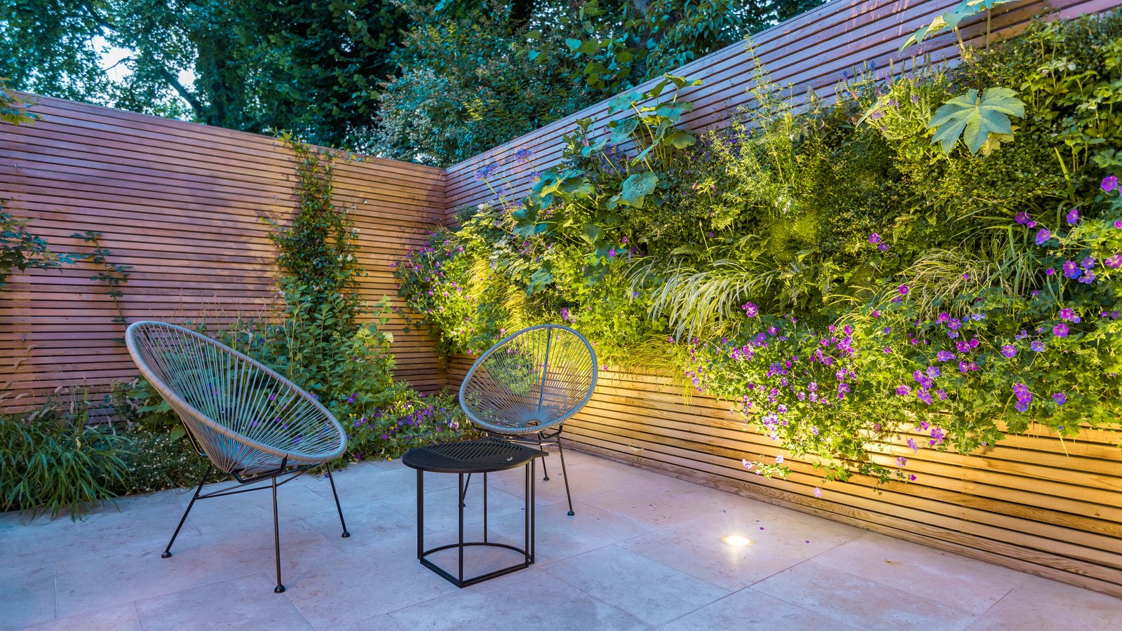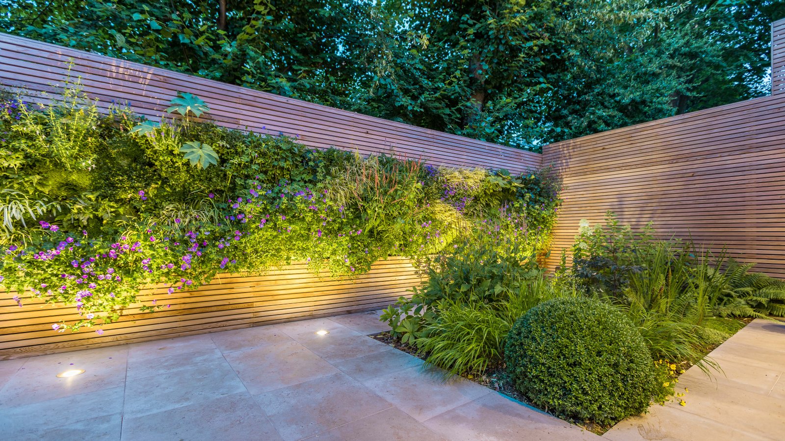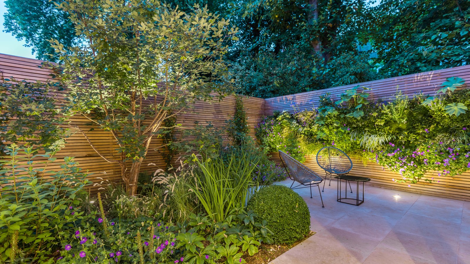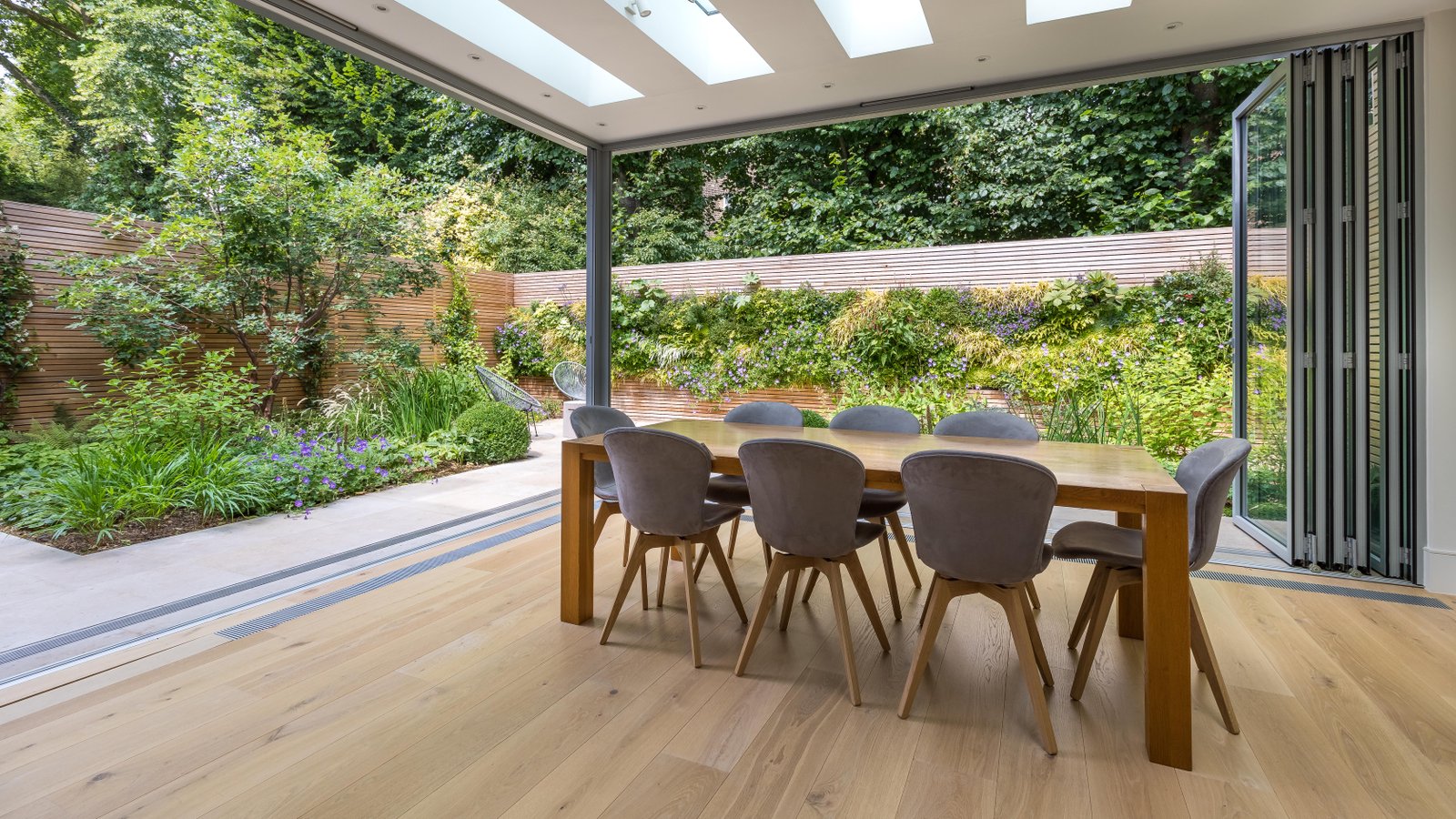 This small urban garden serves as a backdrop to an interior and provides a leafy and dramatic view through the edge-to-edge windows. Exterior gently blends with the interior and provides options for outdoor dining/entertainment all year round due to the carefully selected planting palette. Planting is inspired by the plants that grow naturally within the woodland edge range. Ornamental grasses, soft textures and deep green notes work beautifully together to provide a comfortable, peaceful and lush atmosphere throughout the year. The stunning 10 m long green wall continues the linearity of the design masking the existing rear garden wall. It also makes the space feel wider when viewed from within. Planting from the wall is also referenced at ground level so that the two planes meld together seamlessly to present an over-archingly green outside space.