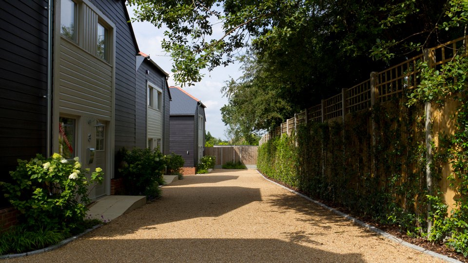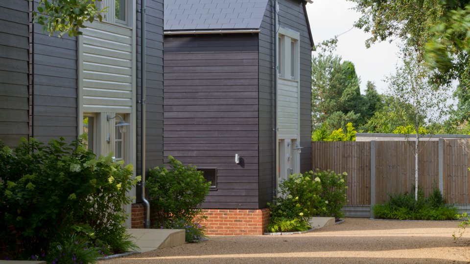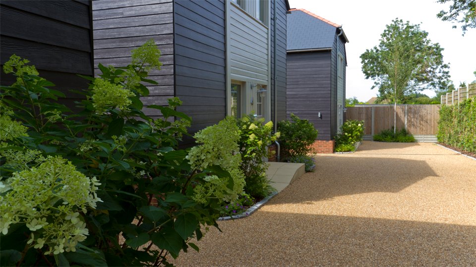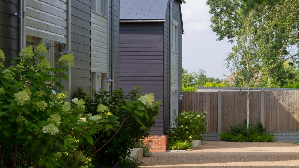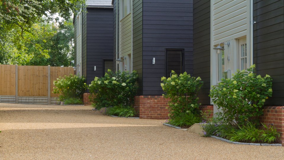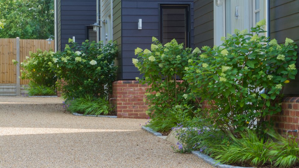 Planting to the front of the houses is simple, featuring hydrangea paniculata ‘limelight’ underplanted with hakonechloa macra and geranium ‘Rozanne’.