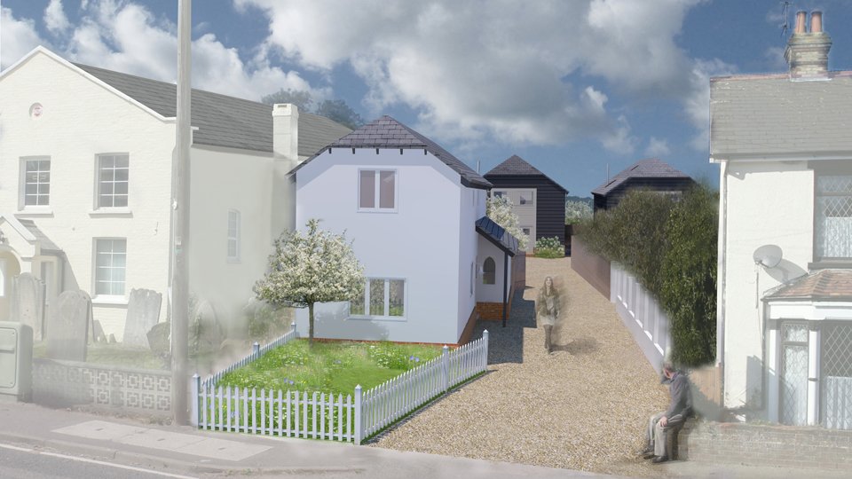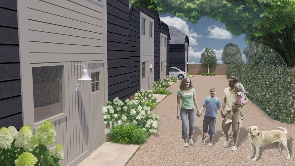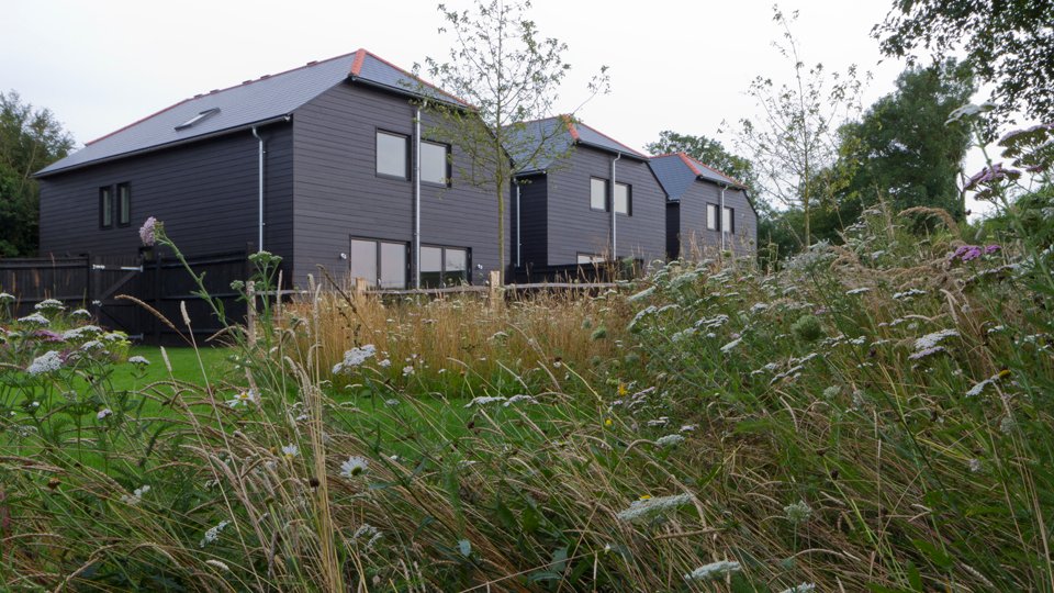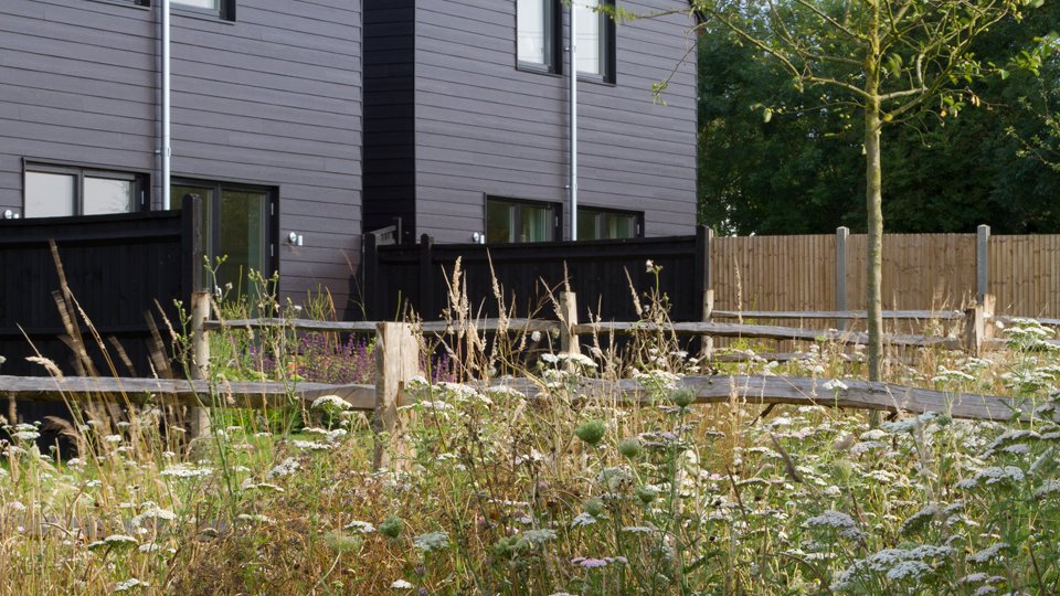 Our solution was to cast a seemingly spontaneous placement of the ornamental apple, malus evereste over the entire site. Rear gardens feature the subtle combination of turf and wild flower meadow which bleeds out to the landscape beyond and creates a single sinuous line across the back of the entire site broken only by cleft post and rail fencing between each property . Circular beds of prairie style planting partially surround brick patios offering a more formal planting close to each house that contrasts to the lightness of the meadow planting.
