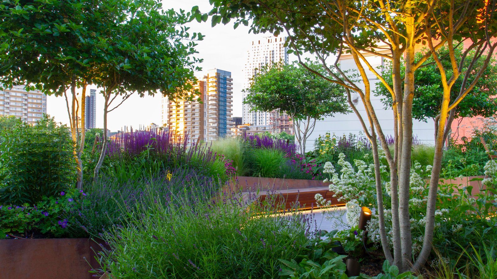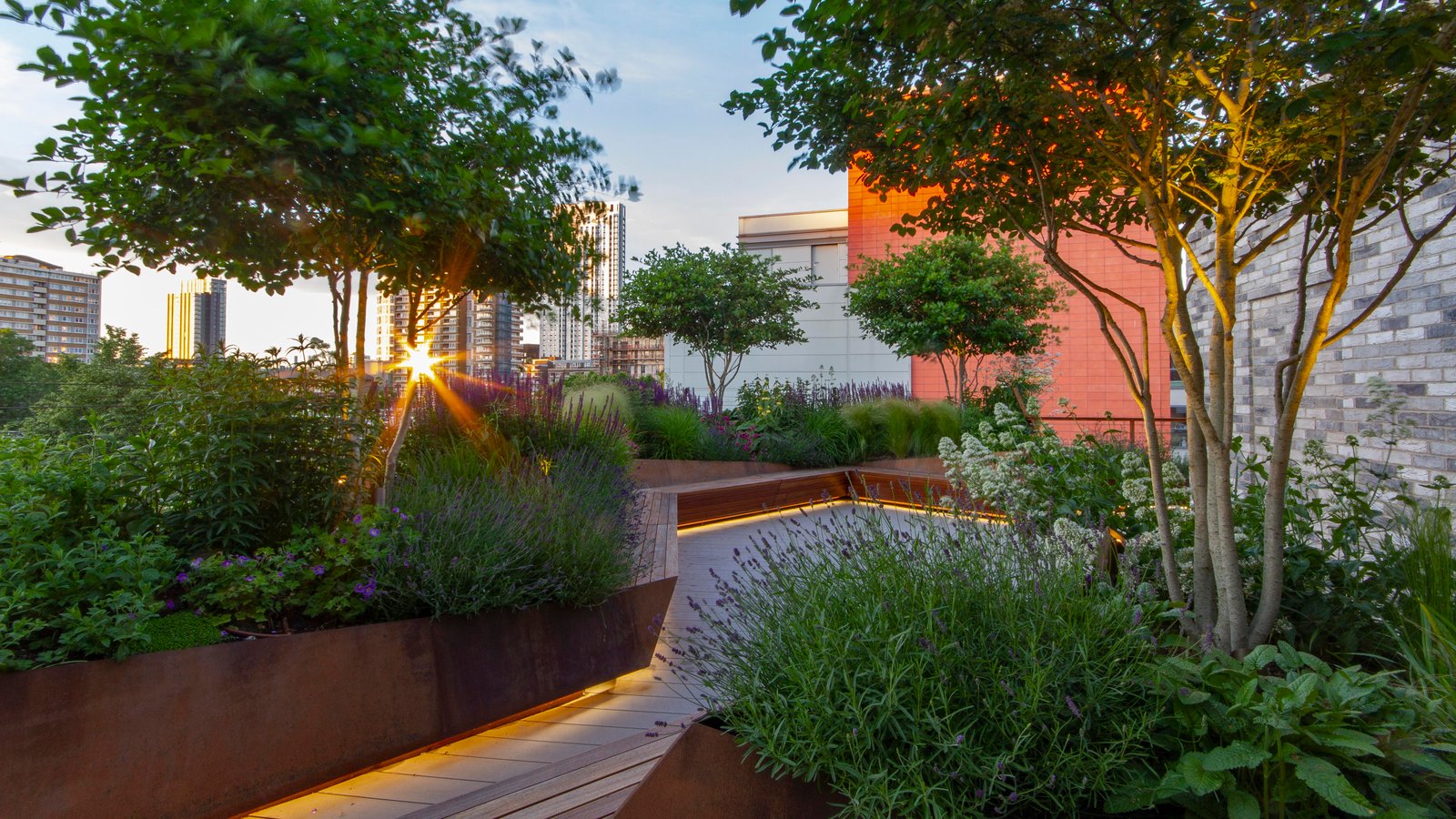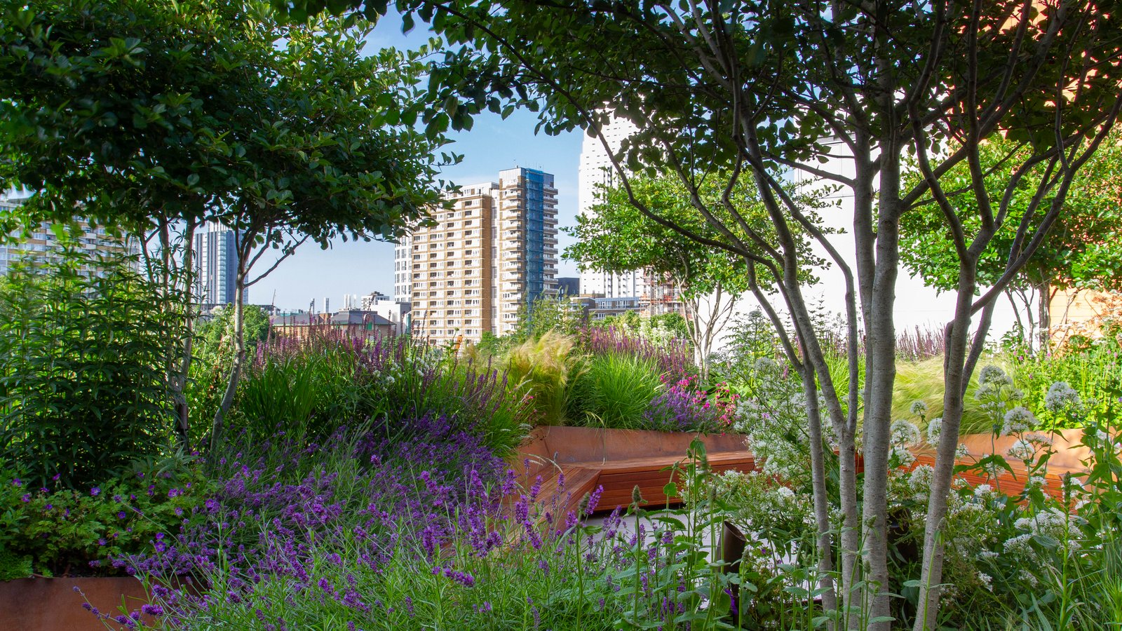 Biodiversity is increased by introducing diversity of habitat as well as species richness. Perennials are chosen largely from the RHS plants for pollinators lists, focusing on attracting bees and butterflies as well as other insects to a floral display designed to stretch from spring into late autumn. By introducing an intensive green roof we are able to lengthen the season of interest and therefore also the period of time for which this area will be of interest to passing wildlife. Shrubs and trees are specified for their berries as well as their flowers (crataegus, sorbus, sarcococca, nandina) acting directly as a food source for insects and birds.
